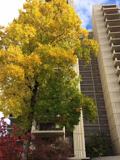 I look forward each year to watching this tree change color. Today, when I shopped at the Farmer's Market, I realized that it was at its peak. Even better, it's surrounded with bright gold trees of different shades so fall colors are everywhere. As I walked home from the market, gold leaves were raining down on my head and it felt like walking through a fall fairyland.
